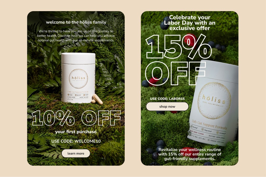 Email is where wellness brands quietly do their best work, and Hōliss needed a system that matched the polish of the product. We built out a full email program from the ground up, designing welcome flows, post-purchase sequences, education series, and the steady drumbeat of campaign sends that keep a brand top of mind. Every email was crafted to feel like the brand itself, warm, informed, and never pushy, with copy and design that made opening, clicking, and coming back feel like the easy choice.